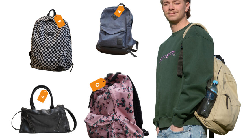 Een praktische rugtas met een effen kleur of een handtas met een vrolijke print. Elke student heeft een andere tas en een eigen smaak. Sieb kocht zijn tas ooit in de sale en het was liefde op het eers ...