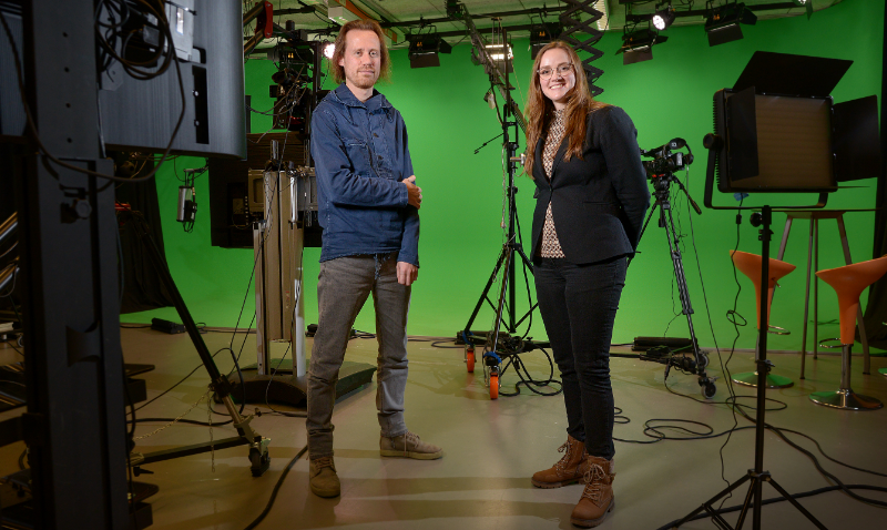 Alleen papier voldoet niet meer. Inmiddels weet elke student hoe je een verslag of reflectie door middel van AI kunt oppoetsen en aandikken. Wat de docent wil weten, is of die student eigenlijk wel begrijpt wat hij of zij (deels zelf) geschreven heeft. Daarvoor moeten ze steeds vaker praktijkgericht toetsen én met elkaar in gesprek. Dat kan op vele manieren. Marijke van Heiningen, team coördinator Multimedia Producties vertelt graag wat het Mediacentrum te bieden heeft: ‘We hebben vier studio’s waarin docenten, medewerkers en studenten van alles kunnen opnemen. Wij zijn er onder andere voor de technische ondersteuning, maar zelf heb ik een didactische achtergrond, dus op dat gebied geven we graag ook advies. Juist de vertaalslag van droge theorie naar visueel aansprekende leermiddelen is een hele uitdaging, maar kan van zoveel meerwaarde zijn voor het leerproces.’