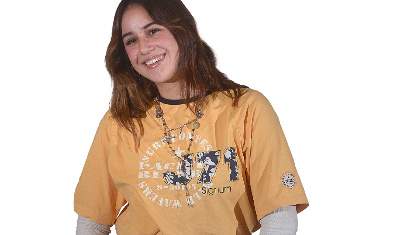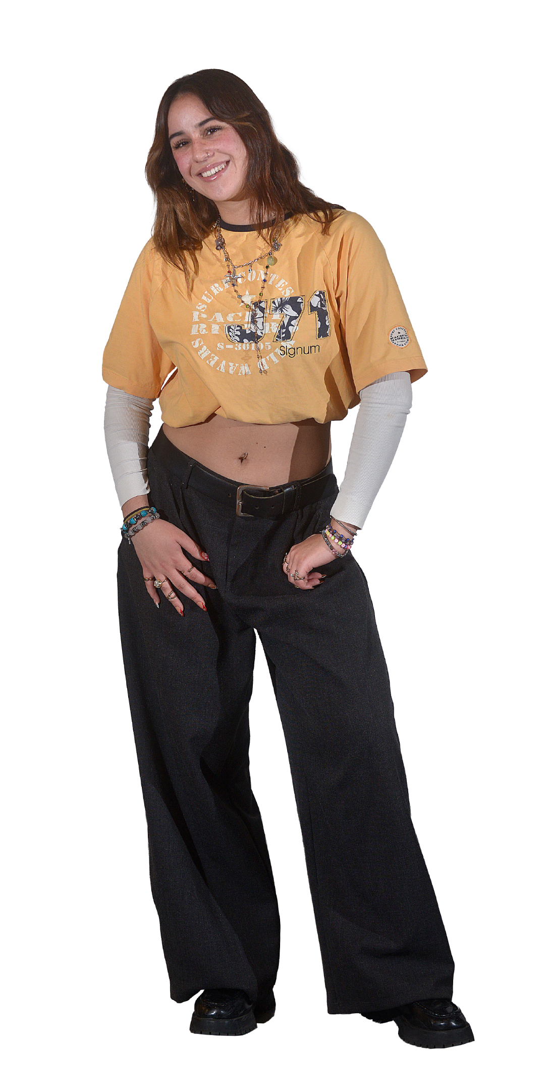 “Ik hou van baggy, en mijn accessoires maken de outfit wat meer girly. Mijn inspiratie haal ik overal vandaan: van social media tot de mensen op straat. Ik koop kleding omdat ik het leuk vind en dan kijk ik thuis wel of ik het met iets kan combineren. Zo niet, dan eindigt het voorlopig in de kast. En ja, die wordt inderdaad een beetje te klein.”